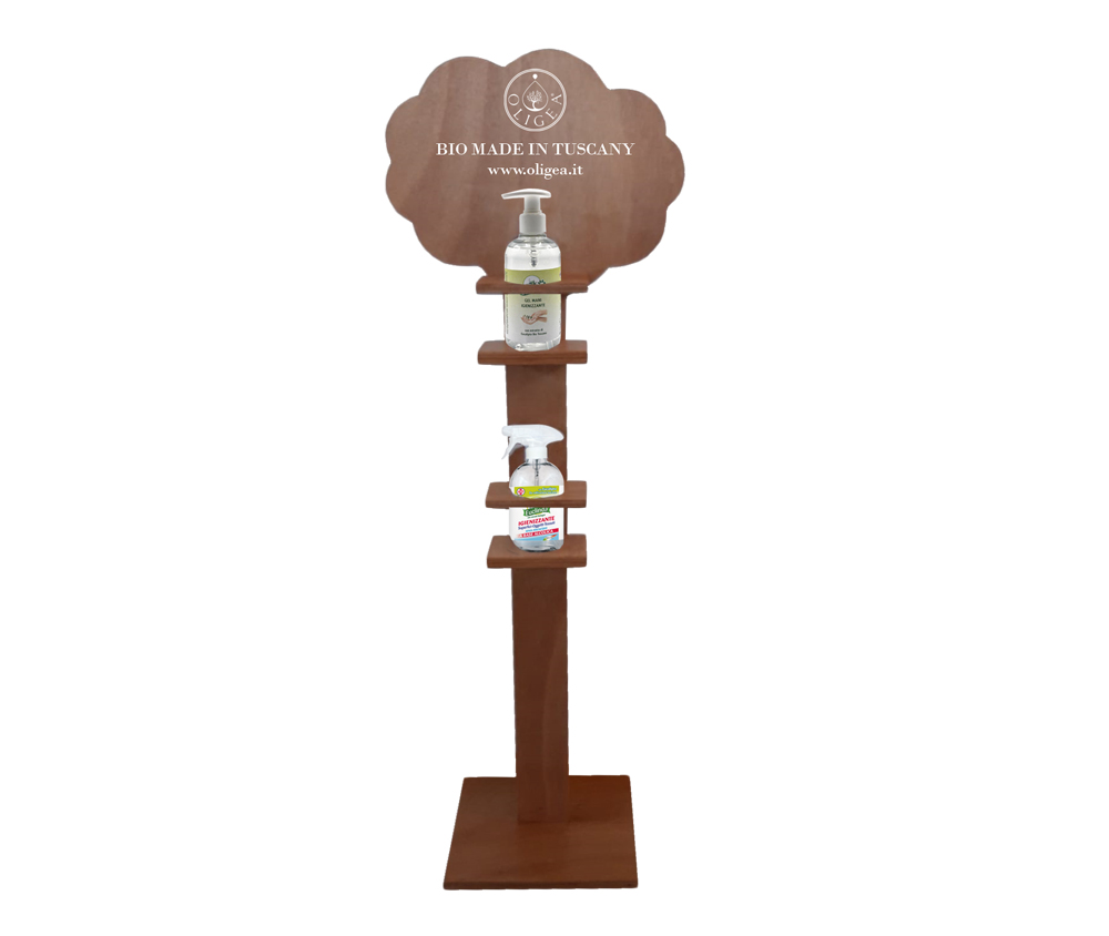 L’Albero Espositore Oligea porta prodotti igienizzanti è realizzato artigianalmente in Toscana, in legno compensato marino. Facile da posizionare in vari ambienti, anche all’esterno, grazie alla propria base ampia e quadrata.