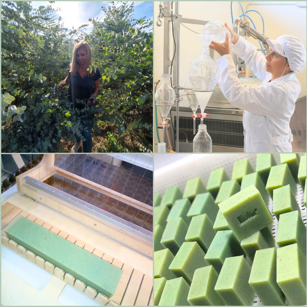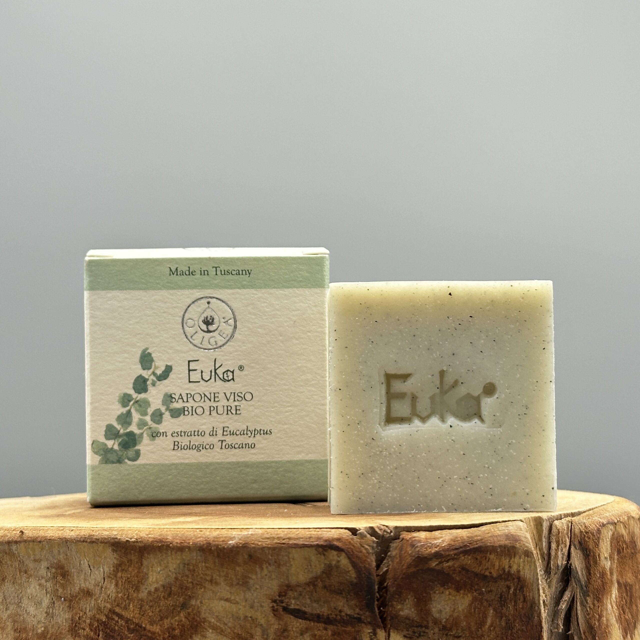 Sapone viso bio artigianale solido della linea bio pure Euka a base di idroessenziali biologici di eucalipto, lavanda, salvia e alloro coltivati nelle nostre coltivazioni biologiche in Toscana.