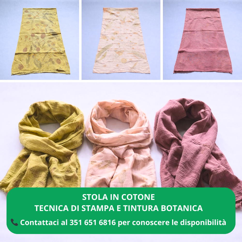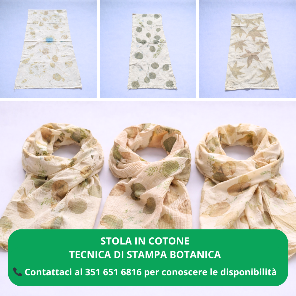 Vedi altre creazioni artigianali realizzate con la tecnica della stampa botanica e tinture naturali. Vai alla pagina dedicata.