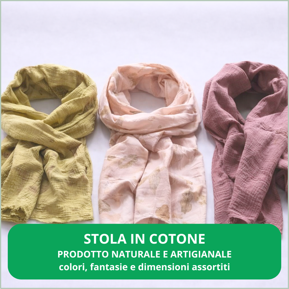 - Opzione 2 – Stola in cotone con stampa e tintura botanica: fondo tinto con estratti di elementi naturali e stampa botanica in evidenza per un effetto più intenso e originale.